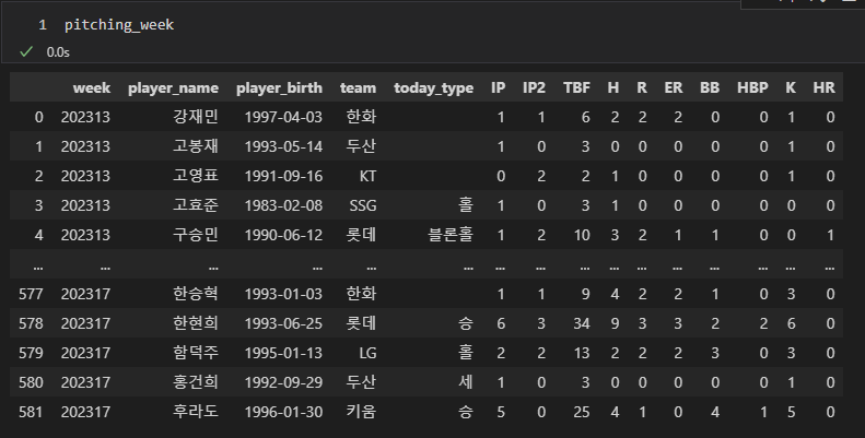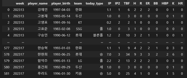 pitching_week = pitching.groupby(['week','player_name','player_birth','team']).sum()[['today_type','IP','TBF','H','R','ER','BB','HBP','K','HR']].reset_index()