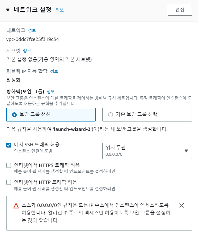 네트워크 설정란이다. 이 옵션은 인스턴스 생성 후 수정해줄것이기 때문에 그대로 남겨두고 넘어간다.