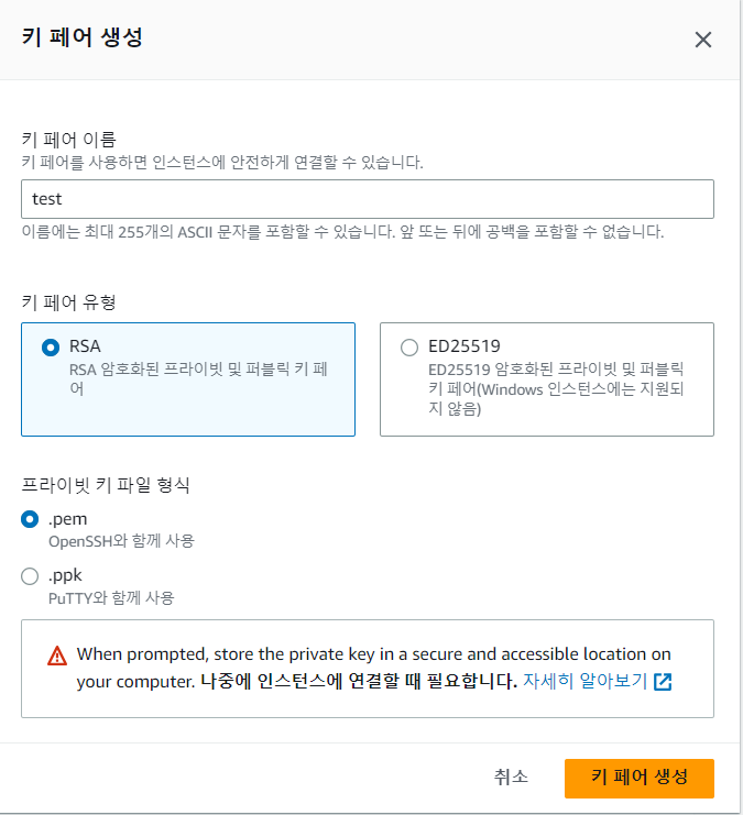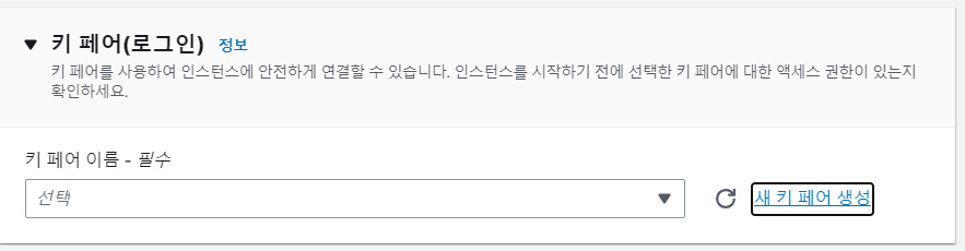 AWS에서 가상 서버에 접근하려면 키 페어가 필요하다. 여기서 필자는 개인키를 생성해서 지정해줬다.