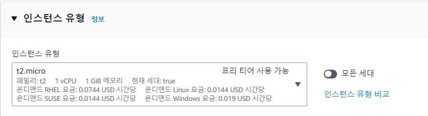 메모리나 CPU 스펙을 선택하는 부분, OS선택과 마찬가지로 프리 티어 사용 가능 문구가 있는 옵션을 선택해준다.