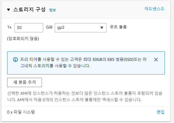 스토리지 구성란이다. 기본적으로 8G가 잡혀있지만 프리 티어를 사용하는 유저는 30G까지 사용가능하므로 30G로 설정했다.