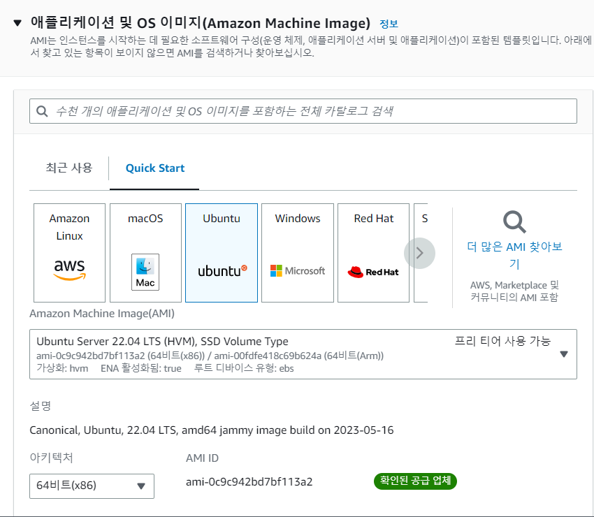 여러 환경이 있지만 필자는 Ubuntu를 사용했다. 여기서 주의할 점은 "프리 티어 사용 가능" 문구가 있는 것만 무료로 사용이 가능하다.