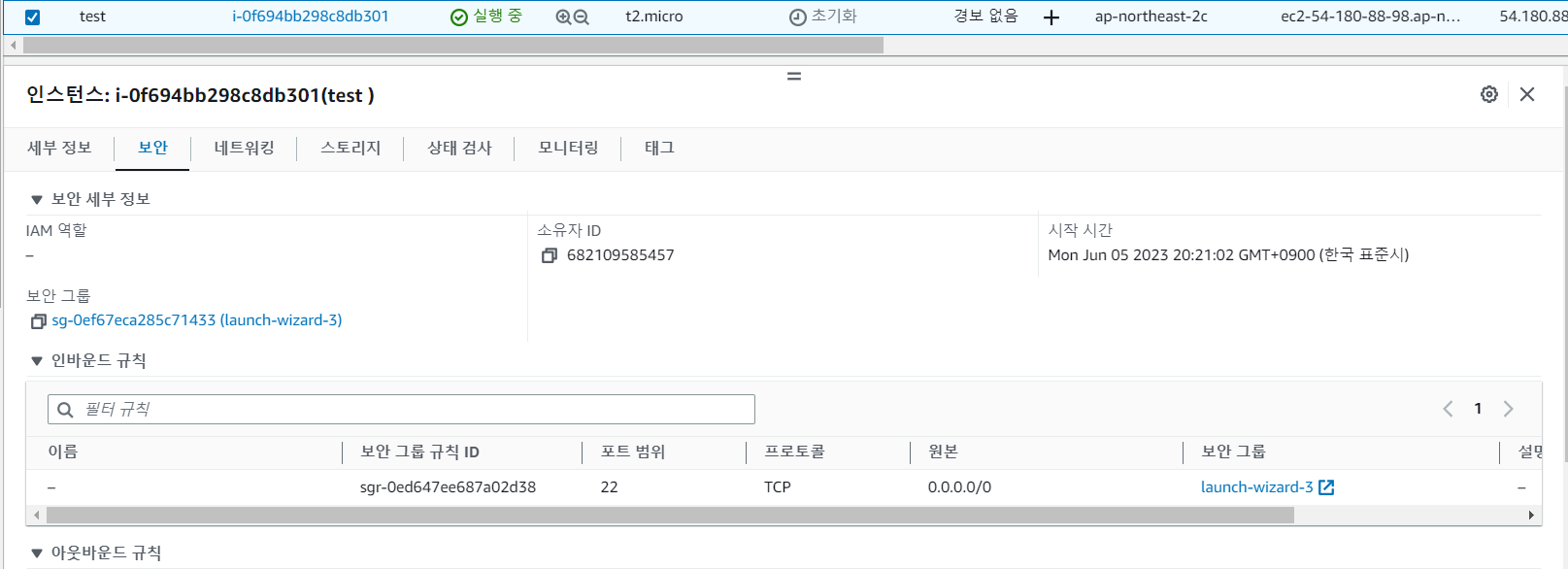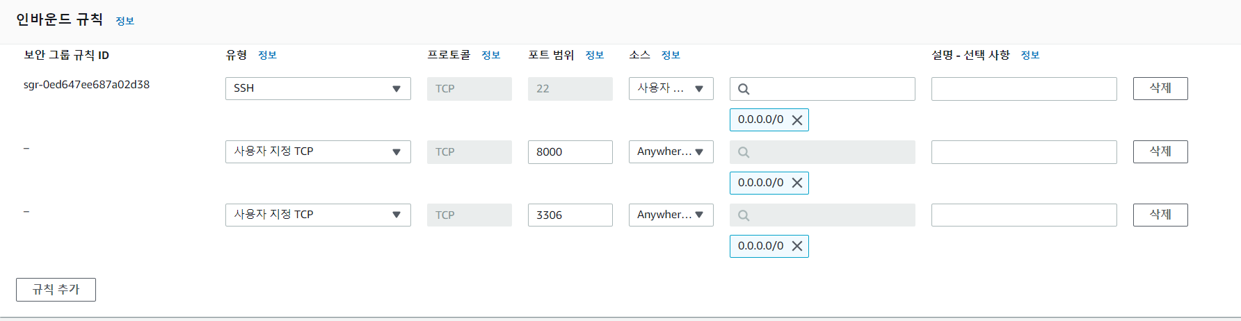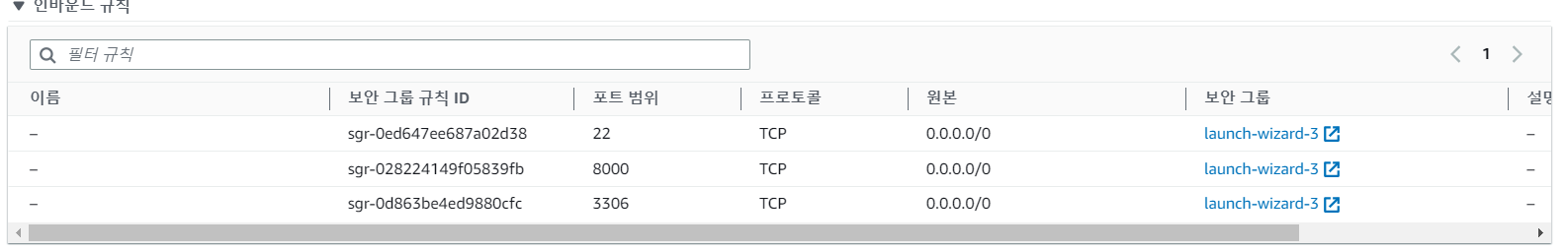 다시 인스턴스 화면으로 돌아와서 보안그룹을 확인하면 8000과 3306포트가 열려있는 것을 확인할 수 있다.