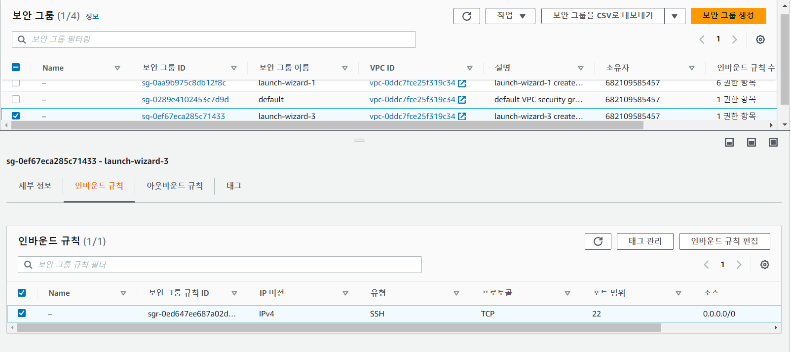 lauch-wizard-3가 방금 생성한 인스턴스의 보안그룹이고 이 보안그룹의 인바인드 규칙을 편집해준다.