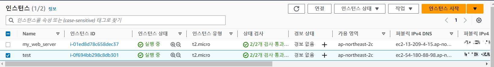 좌측메뉴에 인스턴스 - 인스턴스를 누르면 내가 생성한 인스턴스들이 보일것이다.