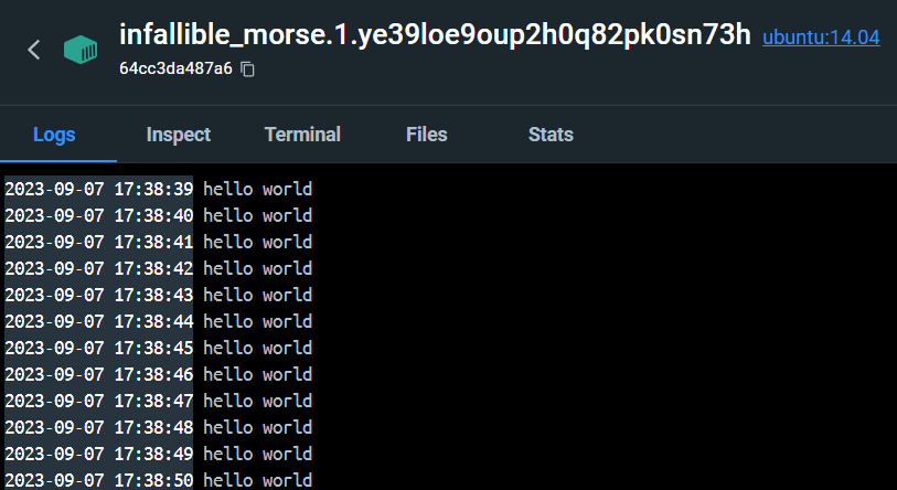 컨테이너도 'hello world'라는 문구를 계속 출력하고 있으므로 정상작동하고 있음을 알 수 있습니다.