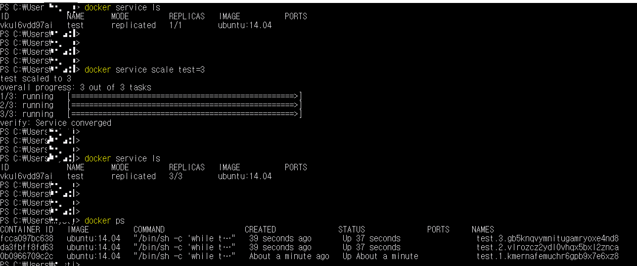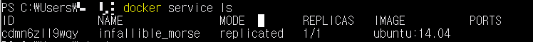 docker service create 명령어로 ubuntu:14.04를 이미지로 한 컨테이너를 생성했습니다.