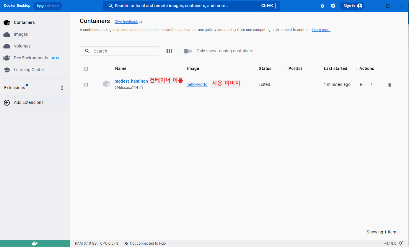 이제 docker desktop을 설치했으니 docker hub에 있는 공식이미지인 hello-world 컨테이너를 생성해보겠다.