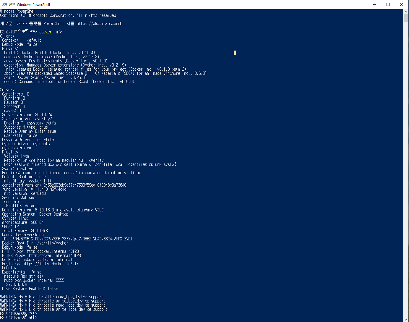 아무튼 power shell에서 docker info 명령어로 docker 버전 부터 확인해보자