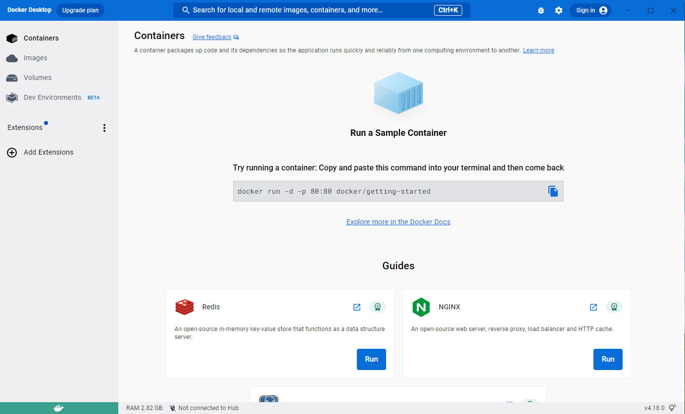 좌측 containers, images, volumes는 도커의 컨테이너(독립된 가상환경), images(컨테이너 설계도), volumes(컨테이너의 데이터 저장소)가 있다. 서버에서 수동으로 설치했을 때는 GUI가 없다보니 컨테이너나 이미지를 확인하기 위해서는 명령어로 확인해봐야한다.
