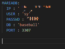 그래서 결국 내 IP주소를 입력해야 접속이 가능했다.. 이 코드들이 Git에 올라가고 있다보니 숨겨야해서 yaml파일을 만들어 접속정보를 담아두기로 했다. yaml파일은 gitignore를 이용해서 감춰뒀다!